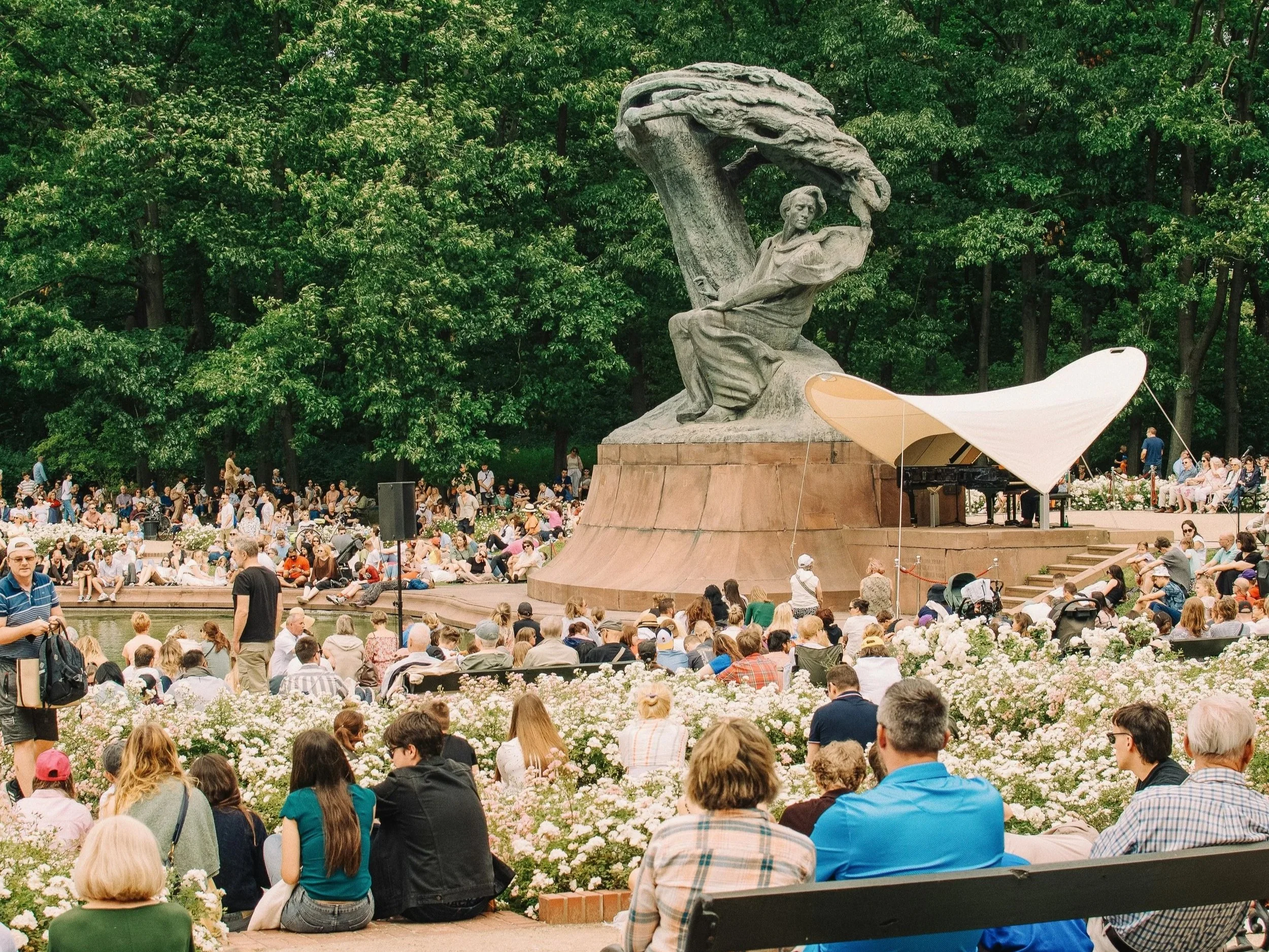 The city is deeply connected to the composer Frédéric Chopin, and there are interactive black stone benches located at key historical sites. Each bench features a button that plays a segment of a different Chopin composition.